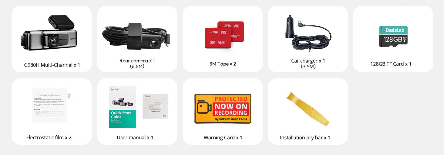 Questa Botslab G980H Pro 3CH è la versione a 3 canali della famosa G980H. La dashcam è dotata di due telecamere nell'unità anteriore che riprendono la strada e l'interno. La telecamera posteriore con cavo da 6 metri riprende tutto ciò che si trova dietro l'auto con una qualità perfetta.