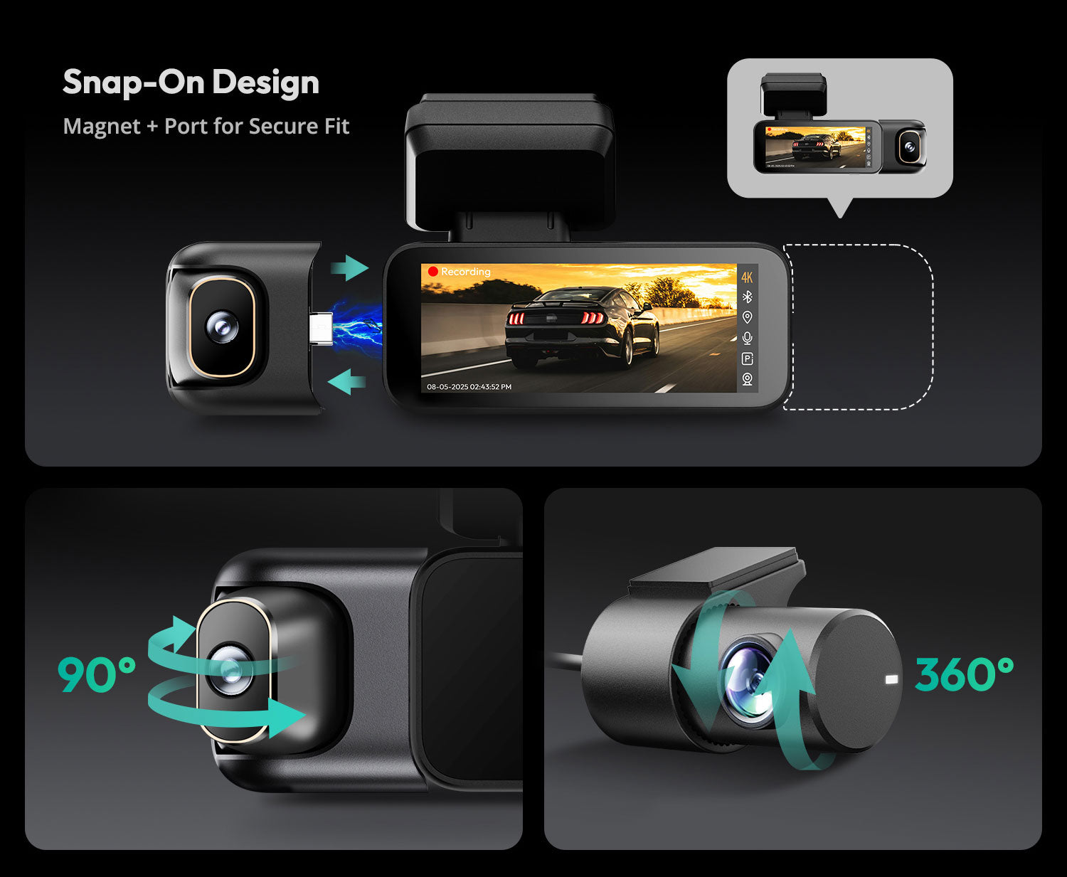 La particolarità di questa dashcam Botslab G980H Pro 3CH sono le tre telecamere separate. L'unità principale, fissata al parabrezza, è dotata di una telecamera 4K che riprende la strada. Sul lato è integrata una telecamera interna che può essere posizionata in tutte le direzioni. Questo rende la G980H Pro 3CH la dashcam ideale per la sicurezza del tuo veicolo durante la sosta.