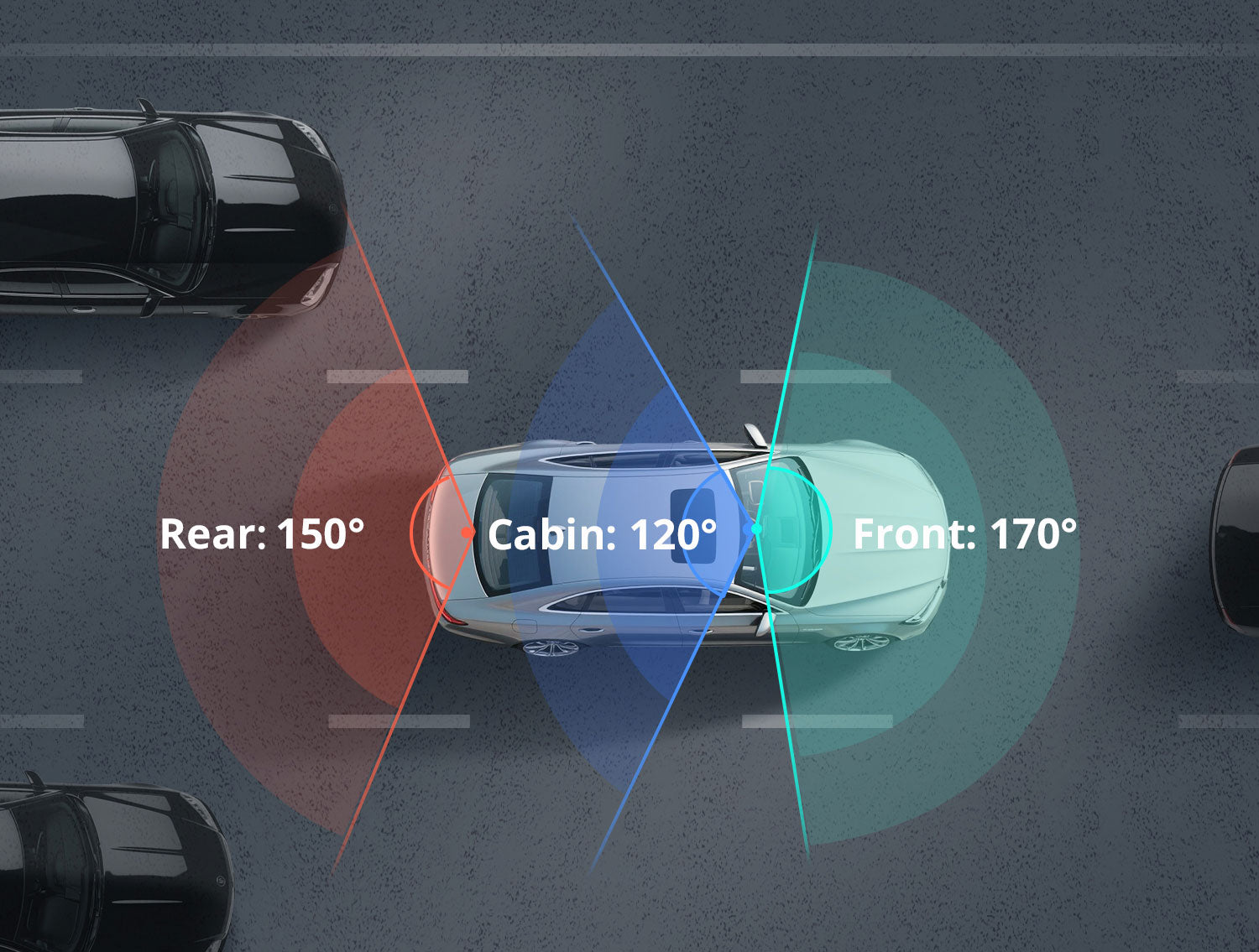 Questo G980H Pro 3CH 4K Wifi GPS ha un obiettivo grandangolare da 170 gradi nella parte anteriore e 150˚ nella parte posteriore. In questo modo viene ripresa una vasta area intorno all'auto, in modo da registrare bene ogni situazione. Le telecamere laterali hanno un angolo di visione di 120˚.