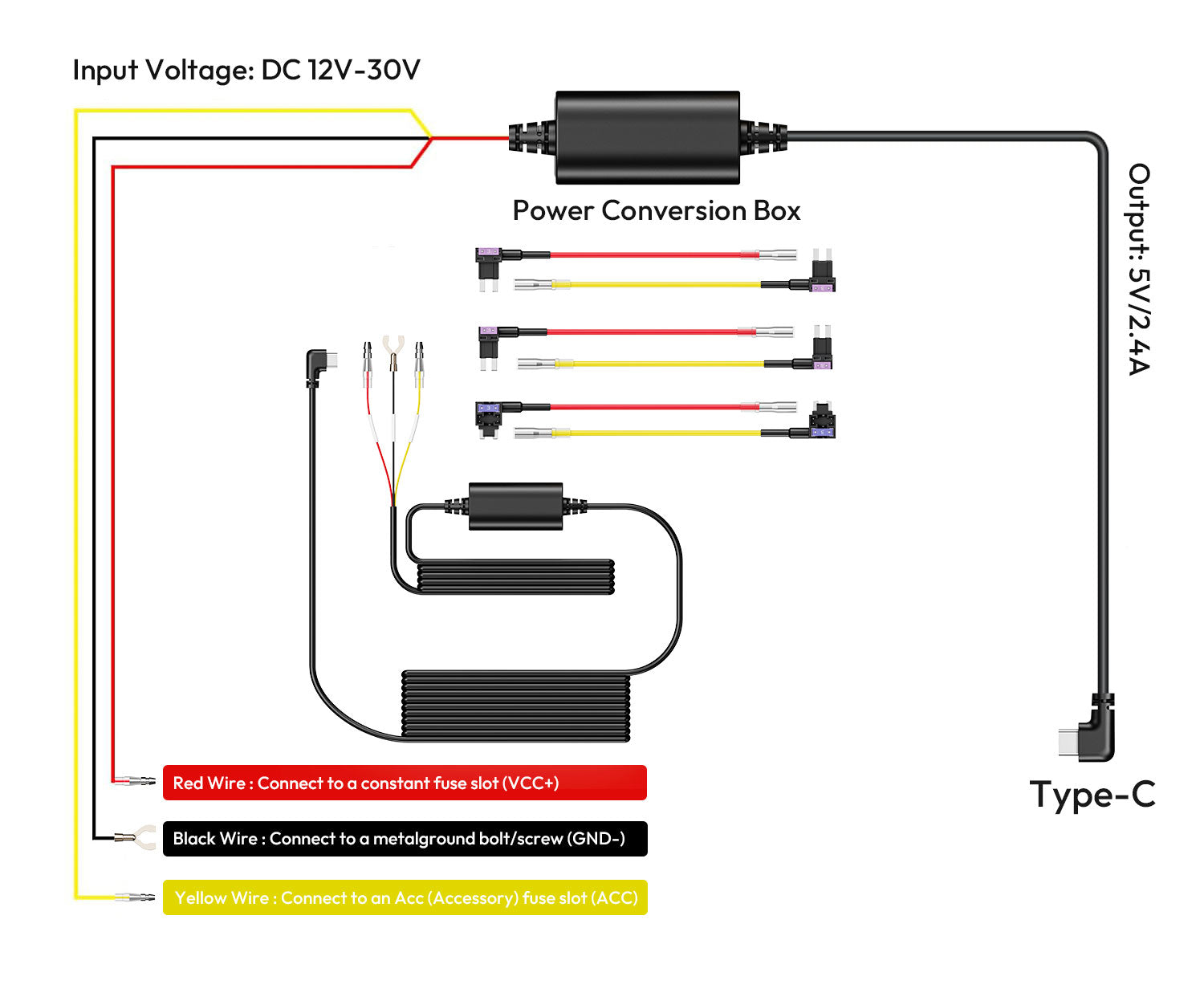 Questo kit cablato USB-C a 3 fili di Botslab è un alimentatore intelligente per tutte le dashcam Botslab con porta USB-C (HK30 Pro, G500H Pro, G980H Pro, V9H ecc.). Questo alimentatore può essere collegato alla scatola dei fusibili dell'auto per alimentare la dashcam quando l'accensione è disinserita. L'alimentatore Botslab è dotato di tutti e quattro i tipi di portafusibili, rendendo l'installazione molto semplice e sicura.