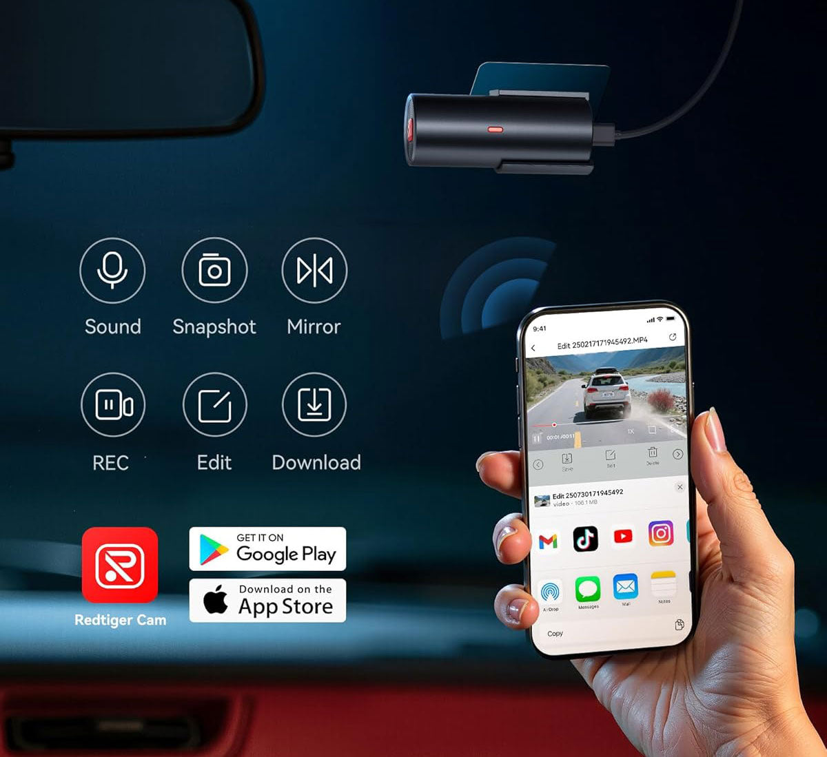 La dashcam è dotata di wifi integrato che consente di connettersi facilmente allo smartphone. Tramite l'app Redtiger per iOS e Android è possibile guardare in diretta, scaricare video e modificare le impostazioni senza rimuovere la scheda Micro SD dalla fotocamera. Il wifi ha una portata di circa 10 metri.