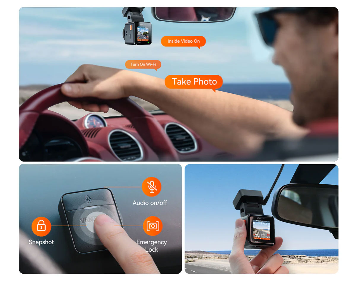 Il Vantrue E1 Pro ti offre la possibilità di controllare la dashcam tramite comandi vocali (in lingua inglese). Comandi come “Make picture”, “Turn off screen”, “Turn on audio” e “Lock the video” ti consentono di utilizzare la dashcam in tutta sicurezza durante la guida e di non perdere nessun incidente.